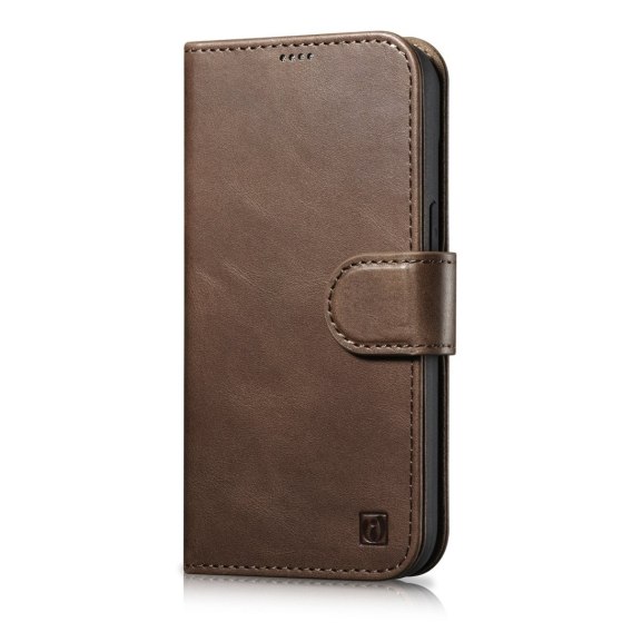 • 2w1 etui skórzany pokrowiec z klapką iPhone 14 Pro Anti-RFID Oil Wax Wallet Case ciemno-brązowy ICARER