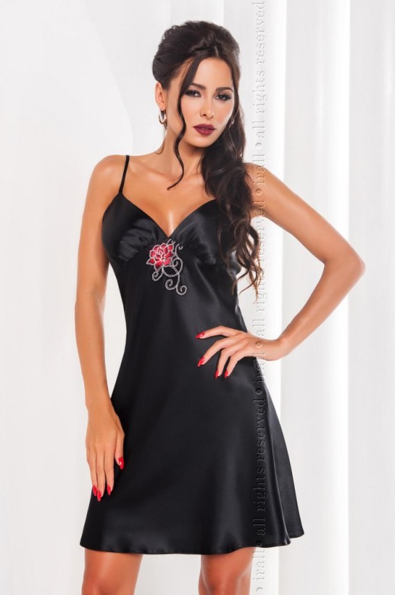 Nowość od Irall dla miłośniczek czarnego koloru. W tej wersji jak zawsze elegancki i wykwintny, w duecie z satyną, tworzy doskonałą podstawę dla tej koszulki nocnej. Fason z profilowanymi miseczkami, bez fiszbin, lekko poszerzony u dołu, jest wygodny i maksymalnie kobiecy. Długość ramiączek możesz regulować. Ps. Uroczym dodatkiem jest tutaj czerwona róża, która zdobi dekolt i plecy. Wspaniała propozycja - wybierz to, co wyjątkowe. Skład: 100% poliester.