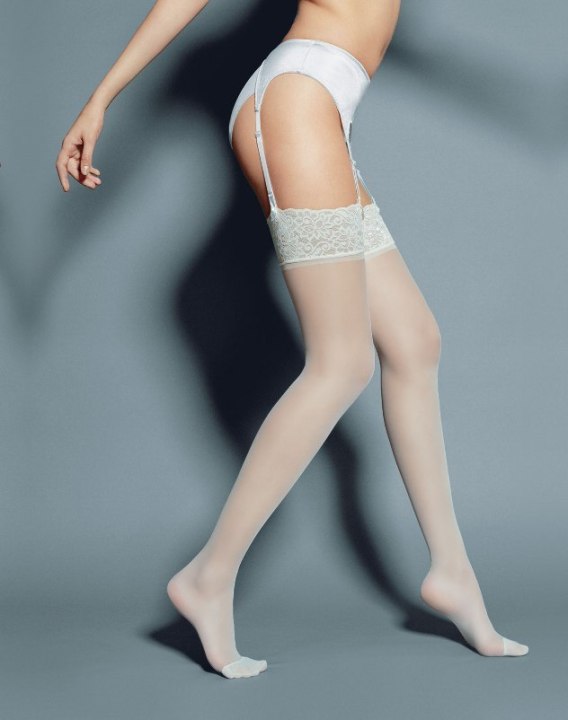 Calze Mary to zmysłowe pończochy, które dopinamy do pasa do pończoch. Luksusowa marka Veneziana. Otulają nogi niczym mgiełka, kuszą seksowną, zdobioną koronką (10 cm). Proponowane do mody ślubnej i nie tylko... Skład: 88% poliamid, 12% elastan.